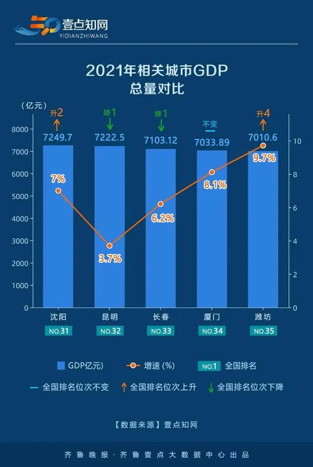 目前,居于潍坊前一身位的是副省级城市厦门,二者的差距仅仅是23.39亿元。再往前数,与潍坊差距在300亿以内的城市还有沈阳、昆明、长春,三者均为省会城市。2021年,沈阳、昆明、长春、厦门的增速分别为7.00%、3.70%、6.20%、8.10%,均低于潍坊增速。